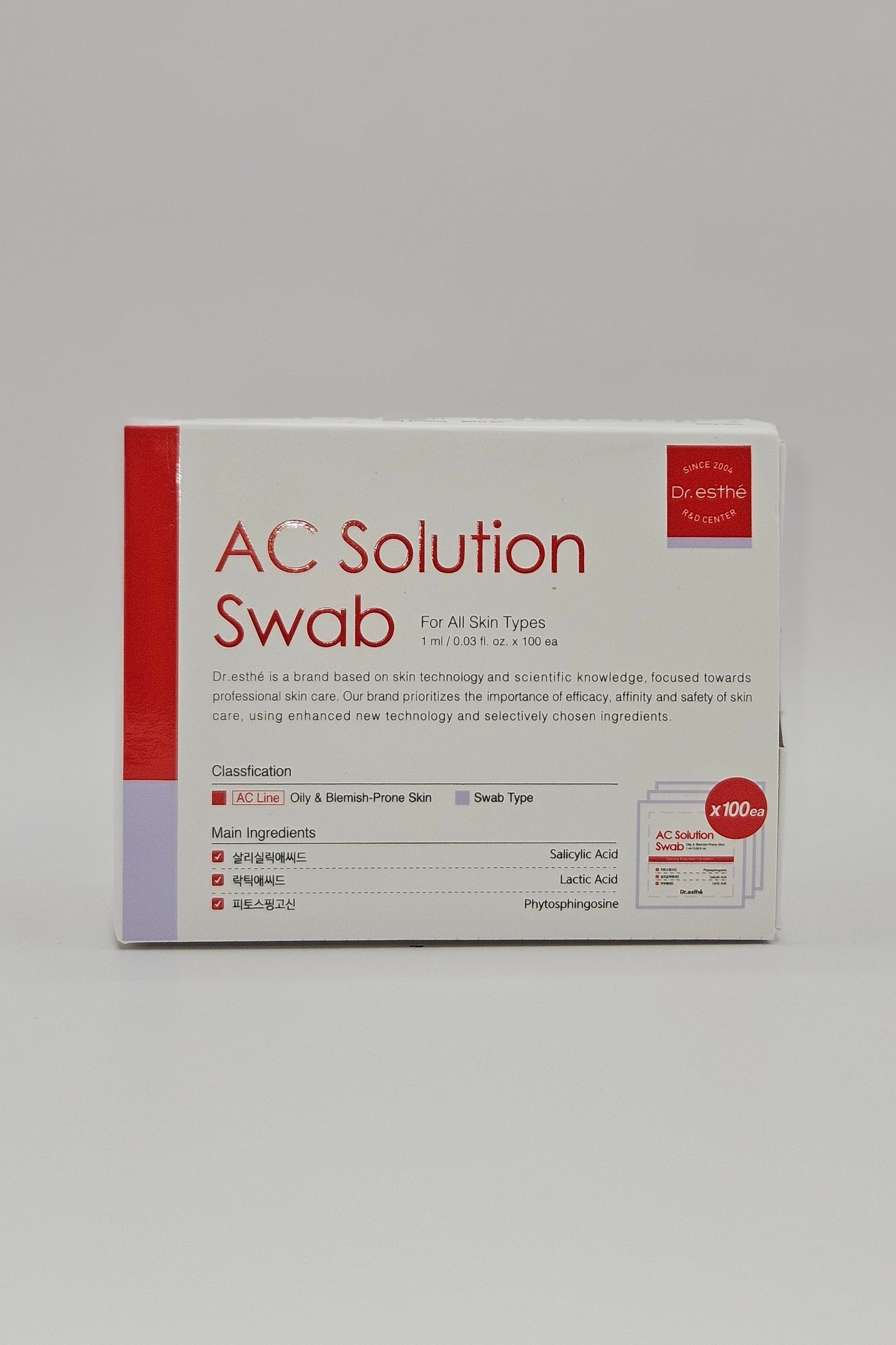 The AC Solution Swab 100 ct boasts a potent combination of skin-soothing ingredients that eliminate acne-causing bacteria and improve skin oil balance. With regular use, these pads can refine pores and strengthen the skin barrier for a clearer, more radiant complexion.